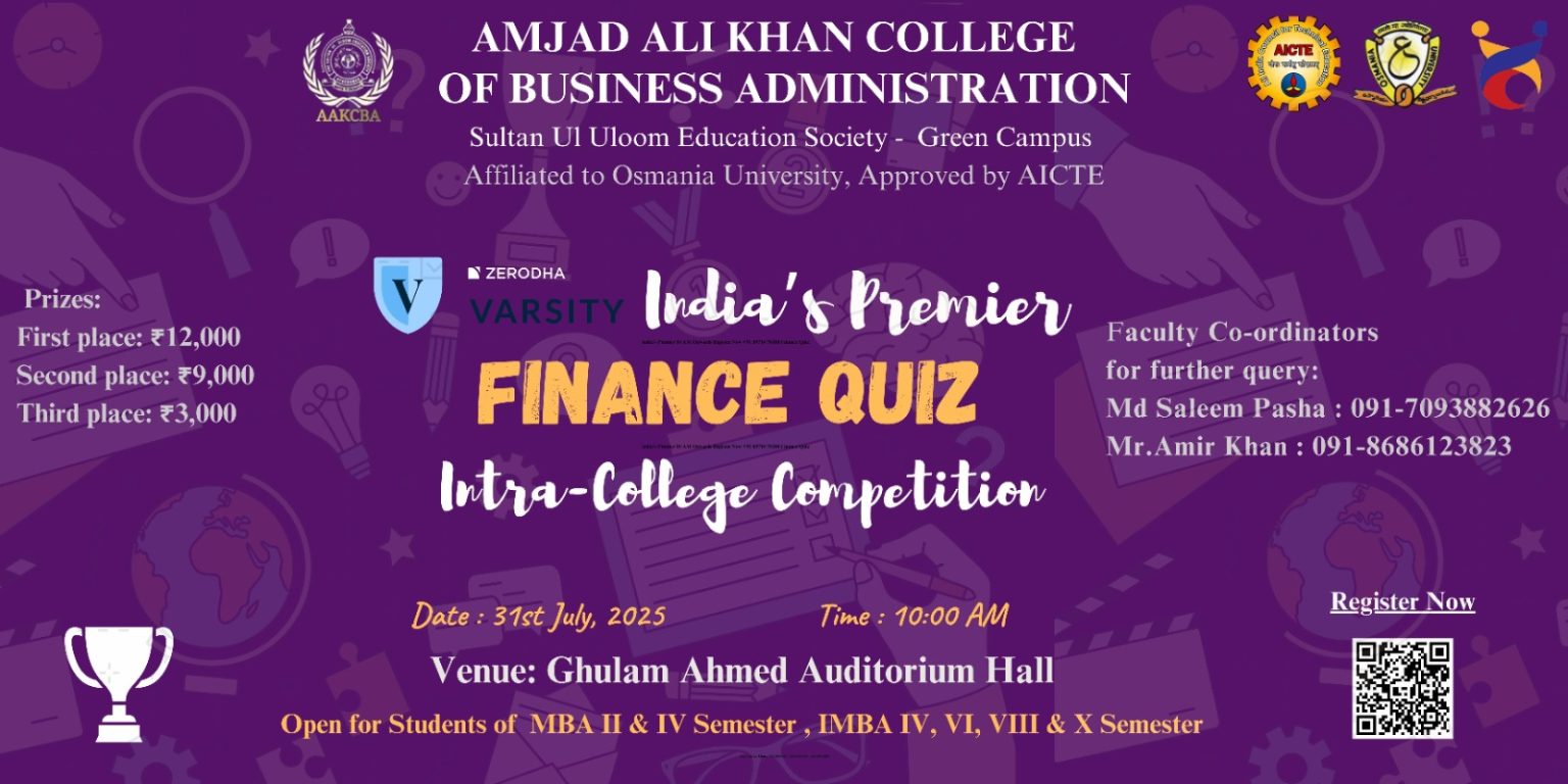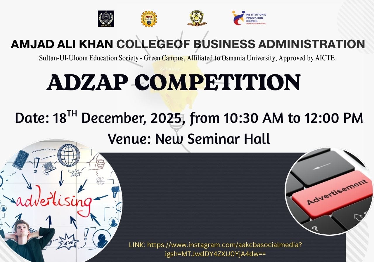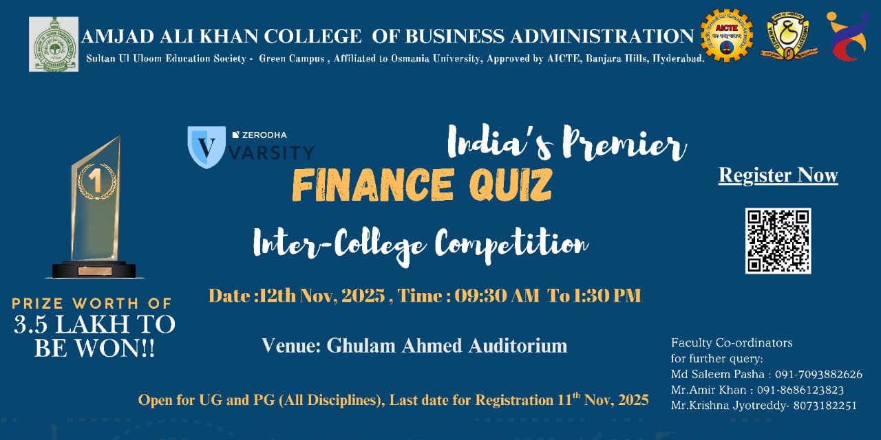 The Amjad Ali Khan College of Business Administration (formerly Sultan -ul – Uloom College of Business Administration ) was established in the year 1991-1992 under the affiliation of Osmania University with the approval of AICTE, New Delhi and Govt. of AP. The College has earned statewide excellence and in meeting the needs of industry for professionally trained graduates.