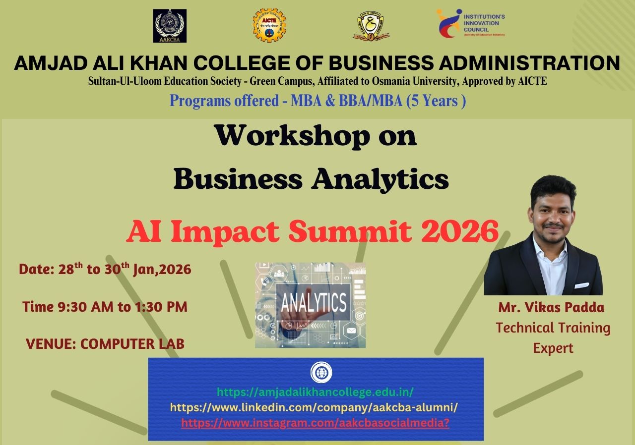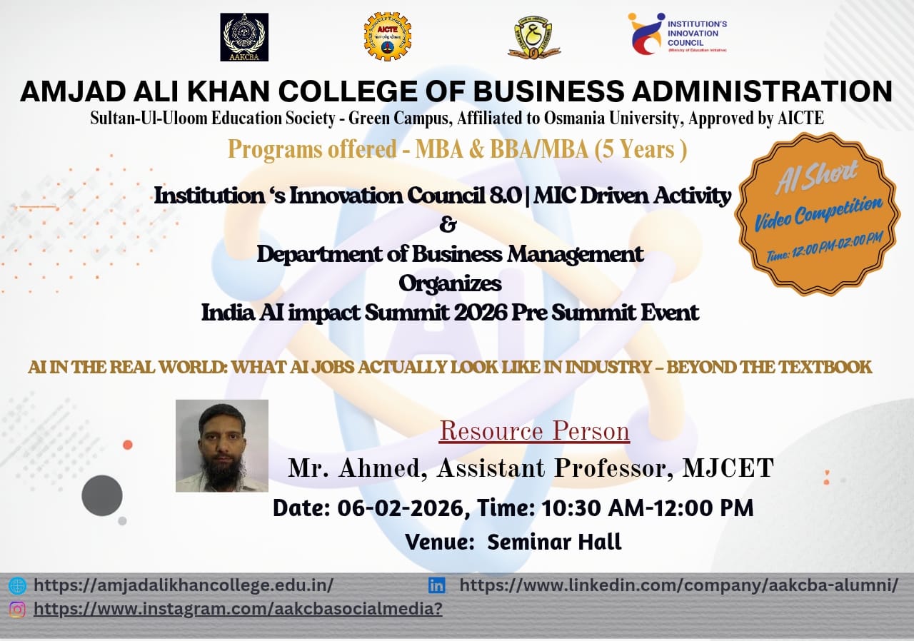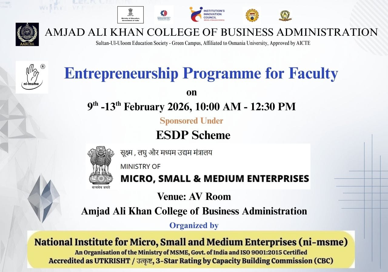 The Amjad Ali Khan College of Business Administration (formerly Sultan -ul – Uloom College of Business Administration ) was established in the year 1991-1992 under the affiliation of Osmania University with the approval of AICTE, New Delhi and Govt. of AP. The College has earned statewide excellence and in meeting the needs of industry for professionally trained graduates.